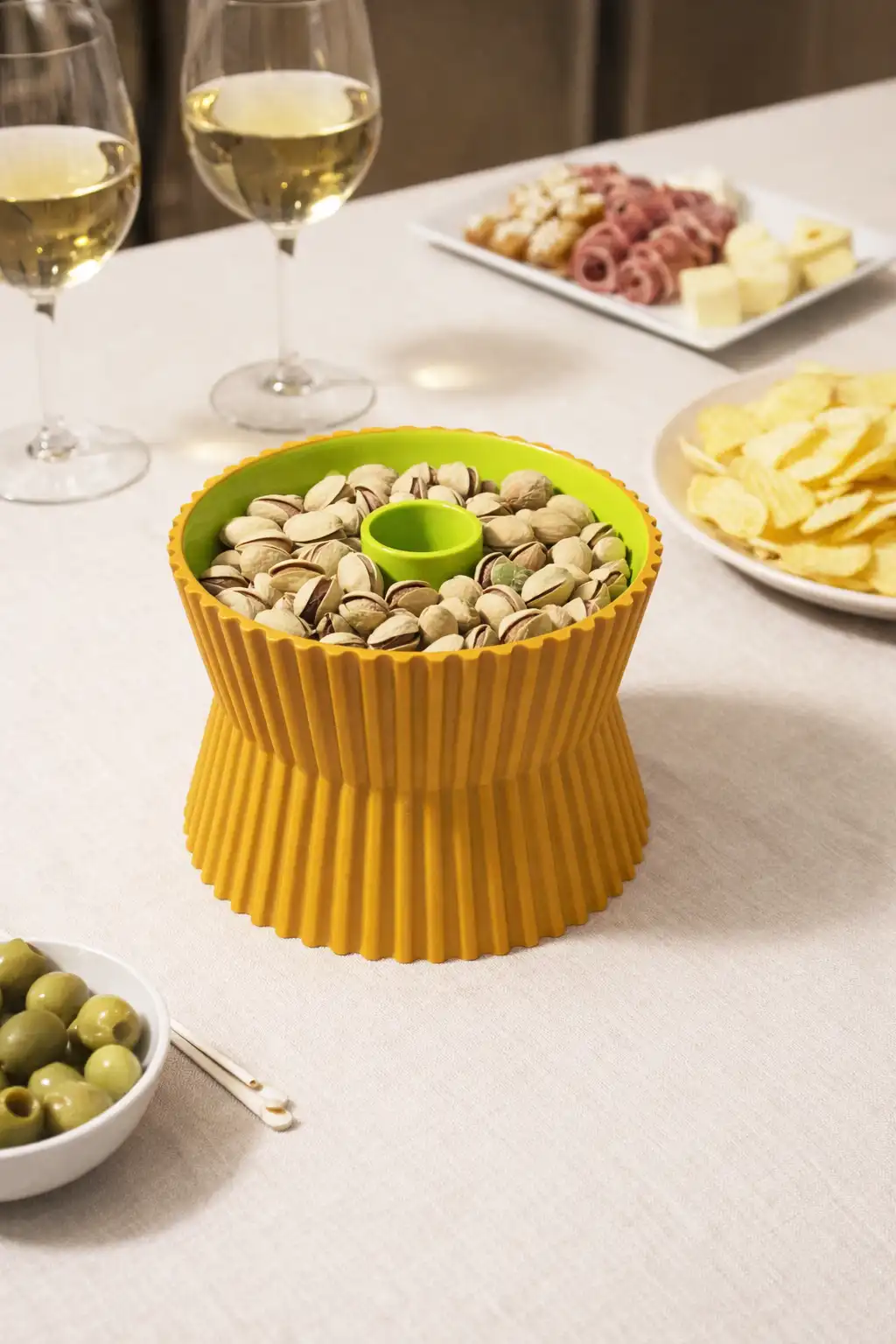 Ce bol à pistaches avec collecteur de coques intégré est l’accessoire idéal pour des apéritifs propres, pratiques et élégants.